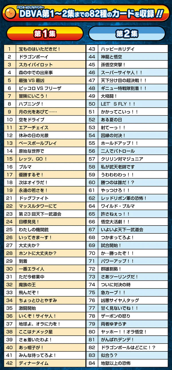 82 cards (including 12 holographic cards) Includes all 82 cards from Dragon Ball Visual Adventure Vol. 1 and Vol. 2!!!